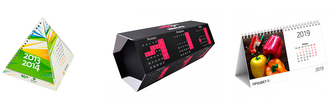 Настольные календари имеют форму пирамиды. Они всегда на виду, поскольку располагаются на рабочем столе. При изготовлении таких календарей используются плотные, устойчивые к истиранию материалы.